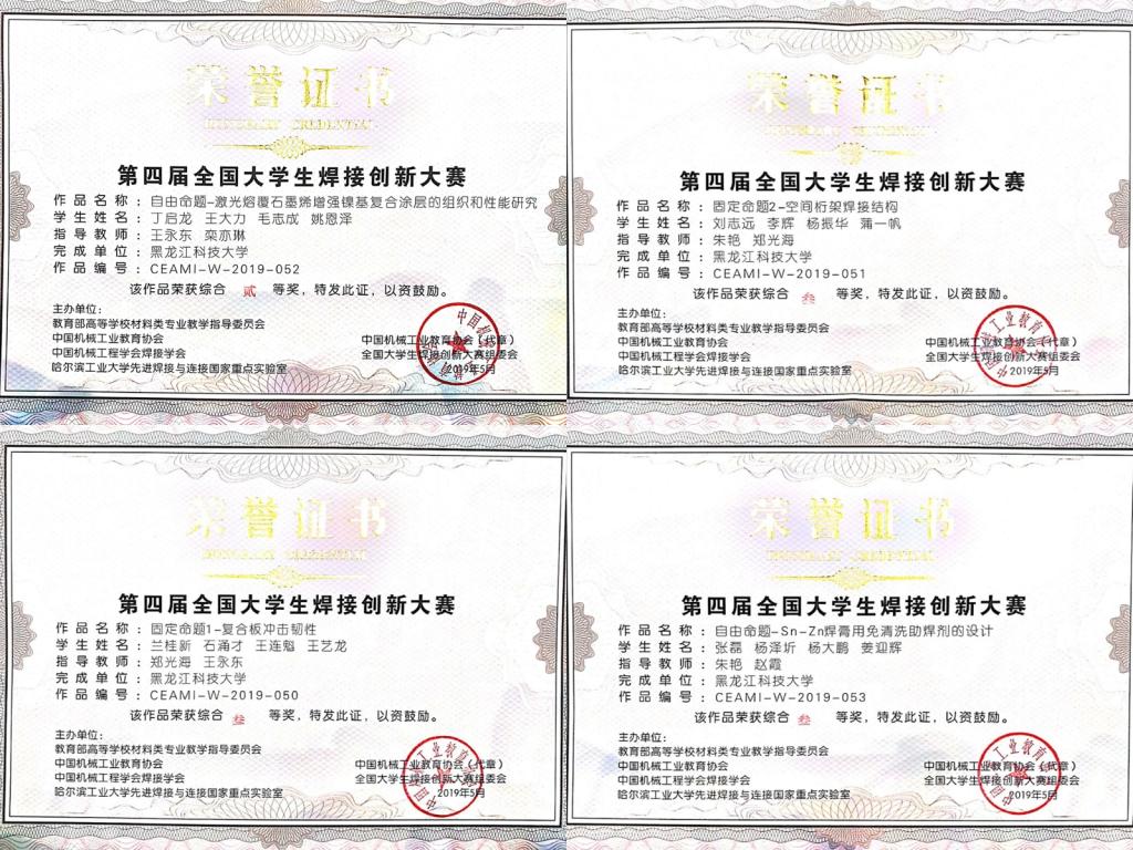 5月17日至5月19日,由教育部高等学校材料类专业教学指导委员会、中国机械工业教育协会、兰州理工大学省部共建有色金属先进加工与再利用国家重点实验室等单位主办的第四届全国大学生焊接创新大赛在兰州理工大学举行。经大赛组委会初赛选拔,共有来自哈尔滨工业大学、天津大学、江苏大学、哈尔滨理工大学、黑龙江科技大学等53所省内外高校的163支参赛队伍进入决赛,经过激烈角逐,PA官网PA集团官方网站焊接技术与工程专业的4支参赛队在王永东、郑光海、朱艳等焊接教学团队教师的指导下取得佳绩,自由命题组焊接15级丁启龙同学的团队作品《激光熔覆石墨烯增强镍基复合涂层的组织和性能研究》获得二等奖,焊接15级张磊同学的团队作品《Sn-Zn焊膏用免清洗助焊剂的设计》获得三等奖,固定命题组焊接15级刘志远同学的团队作品《空间桁架焊接结构》和焊接15级兰桂新同学的团队作品《复合板冲击韧性》获得三等奖。