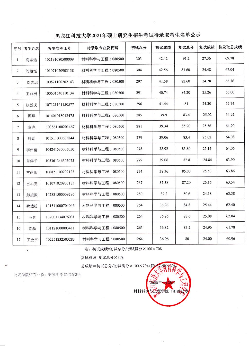 依据《PA集团官方网站2021年硕士研究生调剂及复试录取工作实施细则》,我院发布了调剂招生信息公告,并在调剂系统开放期间内征集志愿。根据考生初试和复试成绩计算出的最终待录取总成绩,我院择优确定以下17名待录取考生,现将名单公示如下: